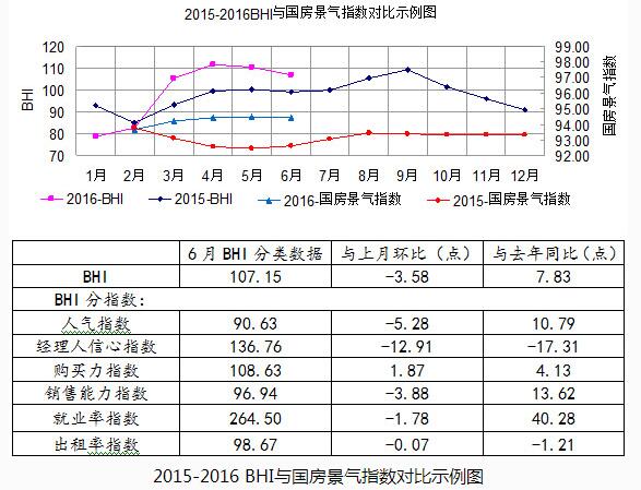 從“2015-2016BHI與國(guó)房景氣指數(shù)對(duì)比示例圖”中可見(jiàn),2016年上半年國(guó)房景氣指數(shù)整體位于2015年上方,且2-5月逐月上漲,6月國(guó)房景氣指數(shù)微跌(2015年2-5月逐漸走低,6月止跌微升)。進(jìn)而分析2016年上半年,全國(guó)樓市在“去庫(kù)存”的大背景下,房地產(chǎn)政策偏向?qū)捤桑禍?zhǔn)降息、調(diào)整首次置業(yè)首付款比例等購(gòu)房層面刺激政策接連出臺(tái),不斷刺激房地產(chǎn)市場(chǎng)需求釋放,樓市上半年整體呈現(xiàn)量增價(jià)漲格局。