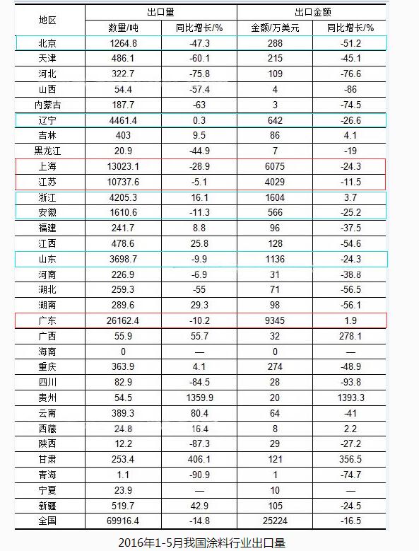 第一,廣東、江蘇和上海作為涂料大省,從最新地區(qū)涂料行業(yè)出口量數(shù)據(jù)來(lái)看(下圖),2016年1-5月我國(guó)涂料行業(yè)出口量累計(jì)達(dá)到6.99萬(wàn)噸,同比下降14.8%,出口金額累計(jì)2.52億美元,同比下降16.5%。雖然出口量整體呈現(xiàn)不同程度的下降,但整體看,廣東、江蘇和上海仍舊是出口大省,出口數(shù)量在萬(wàn)噸以上。